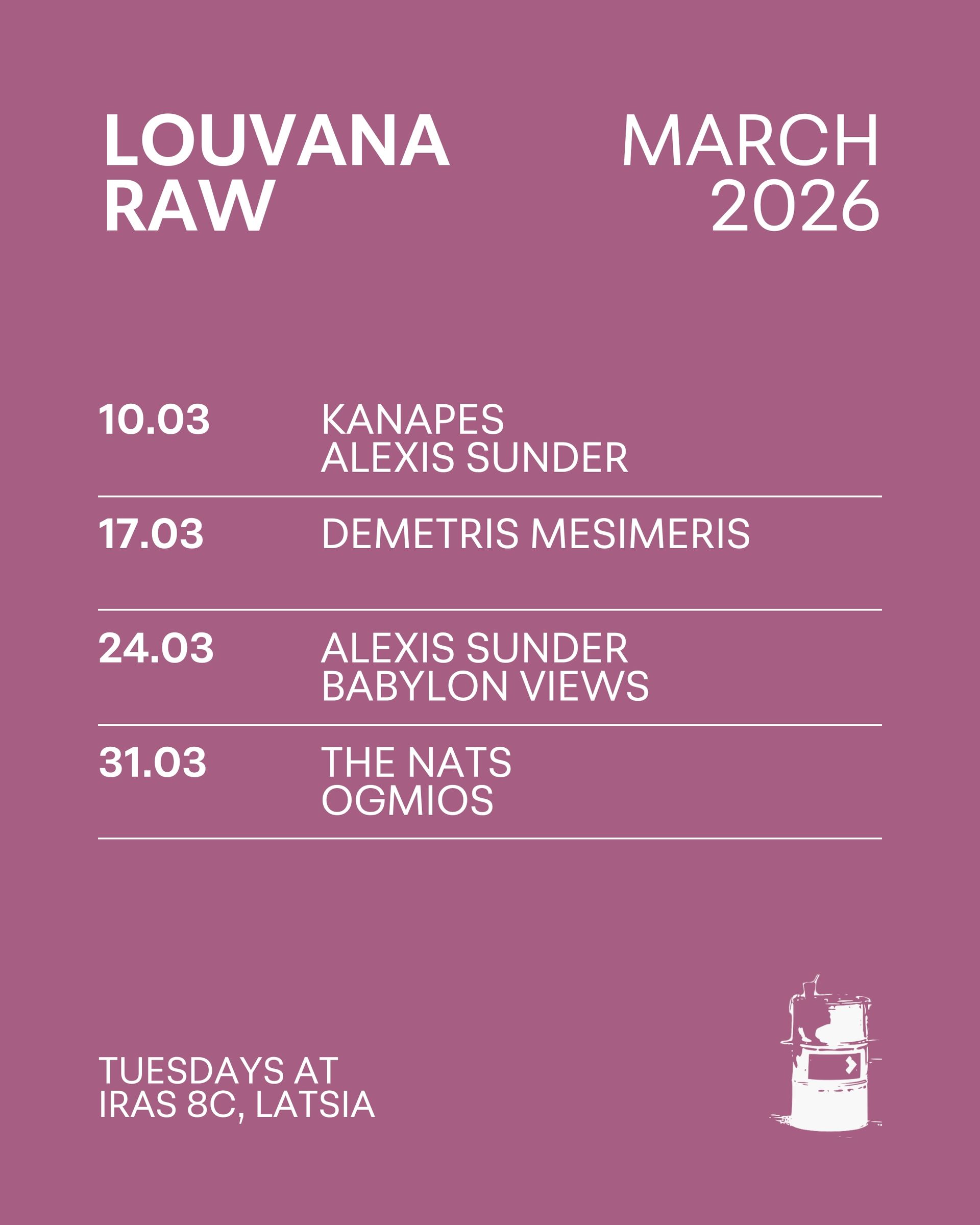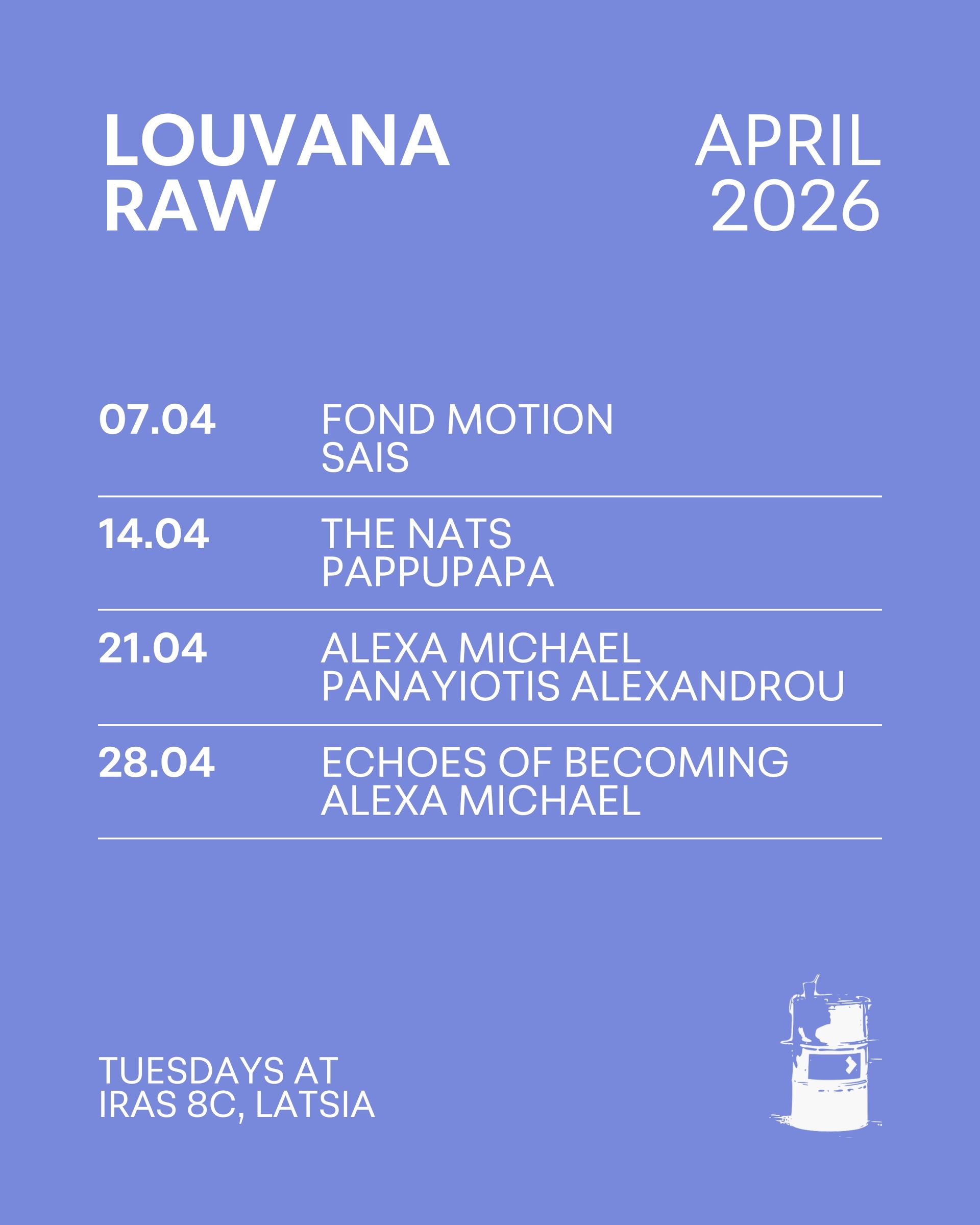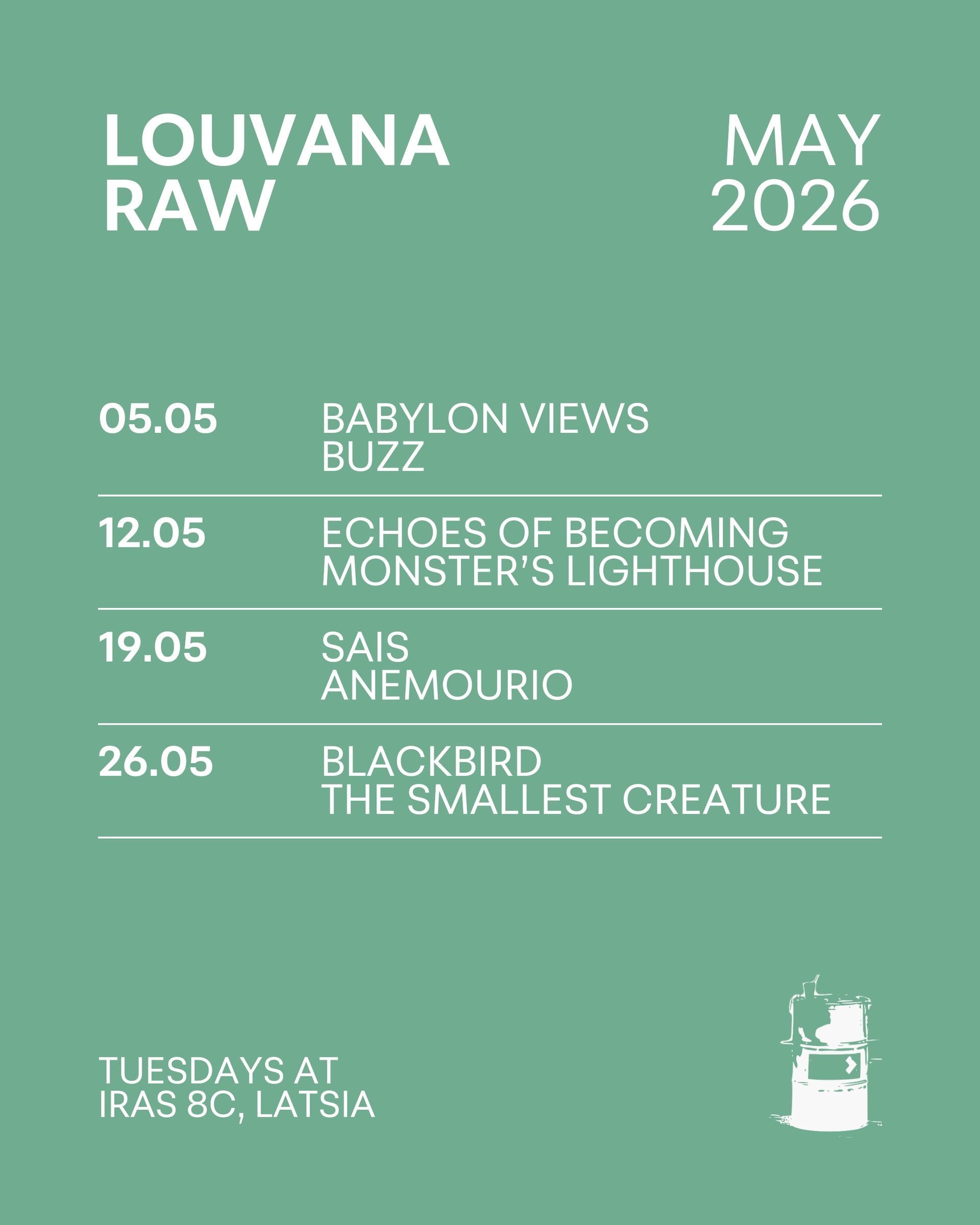 Louvana Raw is a series of concerts showcasing artists from the local music scene. Every Tuesday, two artists present their original music in its purest form; in a back-alley in Latsia's industrial area.